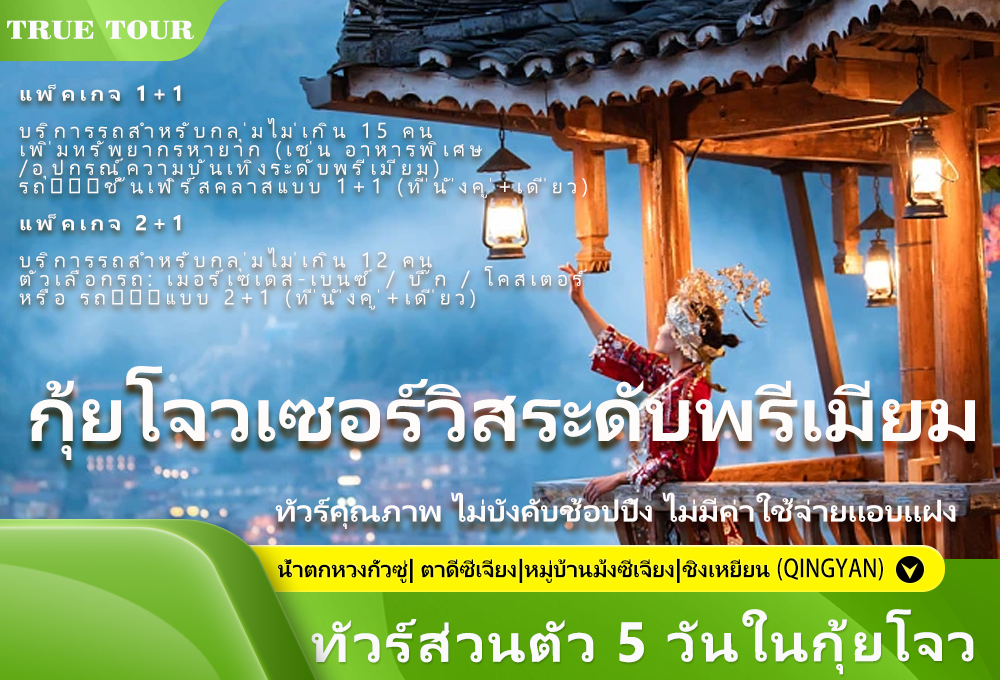 รถยนต์ : Mercedes Benz/บิวอิค/โคสเตอร์/แนวนอน 2+1/แนวนอน 1+1 | มื้ออาหาร: อาหารเช้า และอาหารกลางวัน | ที่พัก : อันชุน/กุ้ยหยาง/ชิงเจิ้น | |